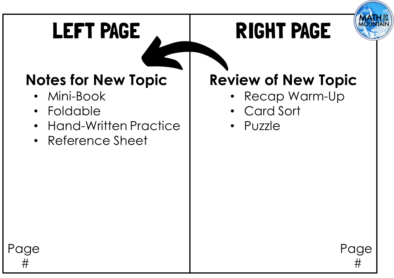 Now, I don’t always stick to the 2-page spread for each topic. Some topics take more than 1 page for notes and 1 warm-up, and that is OK. Don’t get caught up in focusing on it being a rigid structure or else it will become overwhelming.