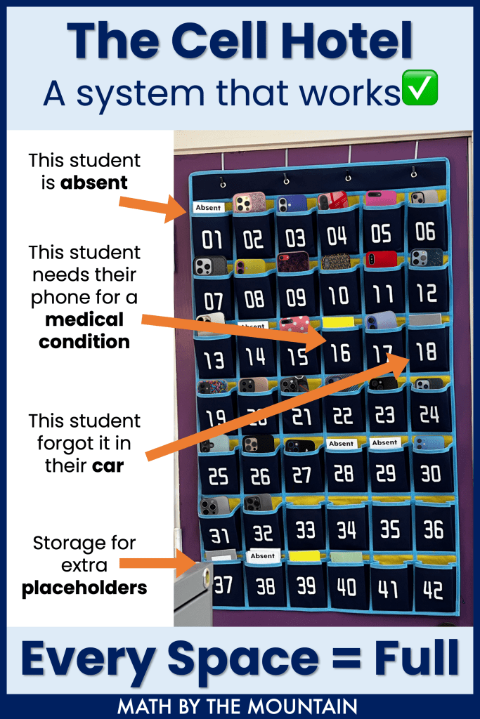 If you’re unfamiliar, a “cell hotel” is basically one of those hanging pocket charts (think shoe organizer) that students place their phones in at the start of class. Each student has a numbered pocket (matched to their seat number), and it becomes part of our daily entry routine.